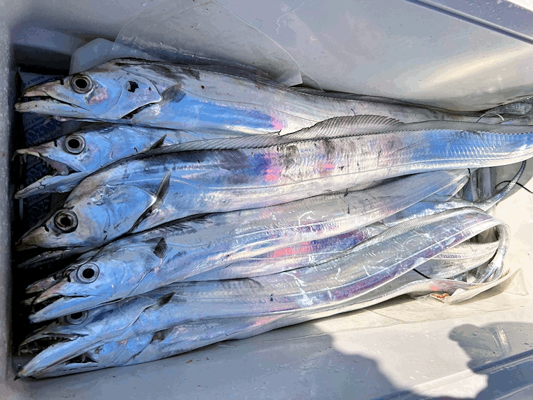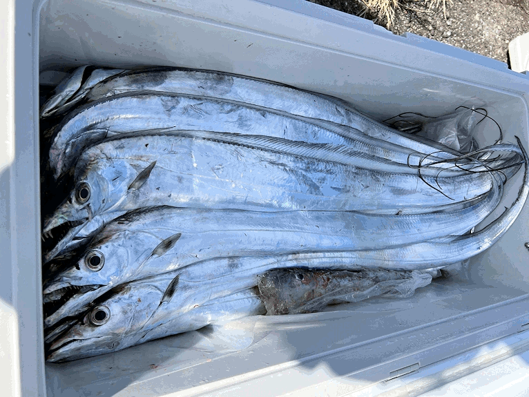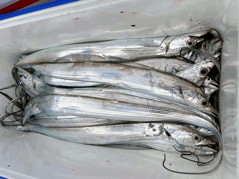 2025年1月5日 本日は太刀魚にて出船しました、1日潮動かず テンヤ 10本〜3本・ジギング 9本〜1本・5本指〜2.5本指・カサゴ・オニカサゴ混じる |
