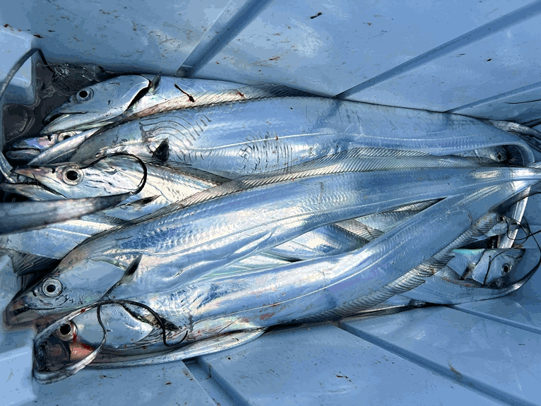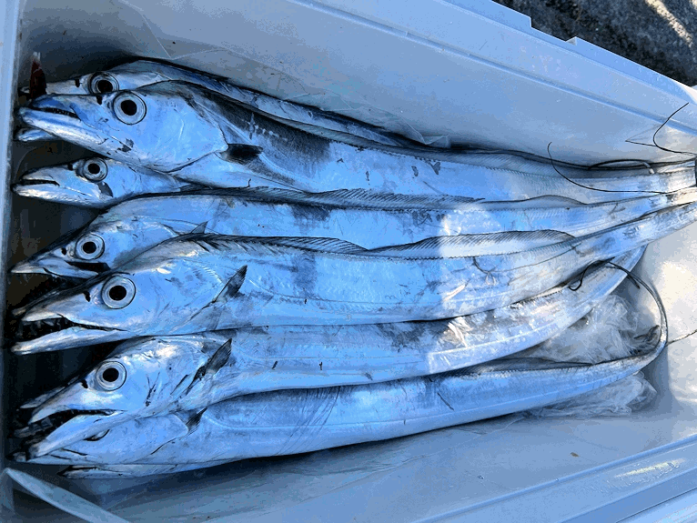 2025年2月17日 本日は太刀魚にて出船しました、前半ポツポツ、後半イルカの接近でお客様と相談して風吹く前1時間鰆キャステイングに行きました 全員キャッチ・太刀魚 9本〜7本・3本指〜2.5本指・本鰆 3.0kg・4本ヒットさせて2バラシ1ラインブレーク・1本キャッチ |