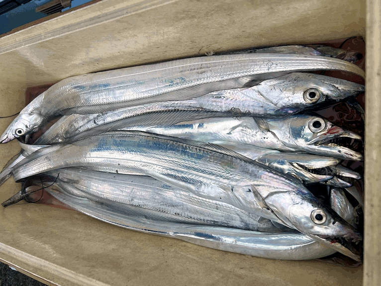 2025年9月23日 本日は太刀魚にて出船しました 前半ポッツポツ〜ポツポツ後半ポッツポツ 餌釣り 41本〜15本・ジギング 20本〜2本(スタートから寝ていたお客様)・F4.5〜F2.5 エサ釣りトップ 静岡市 中塚様 |