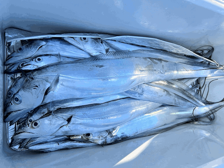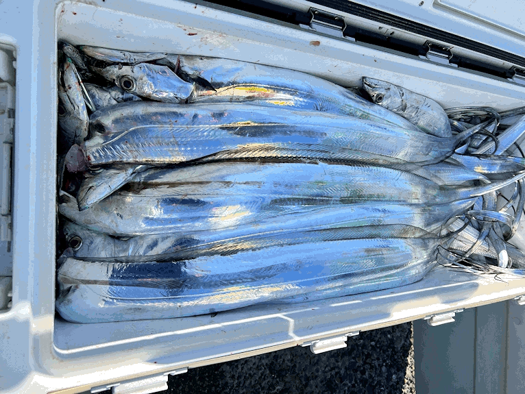 2025年1月13日 本日は太刀魚にて出船しました、前半どのポイントでもかたはありましたが、拾い釣り、後半サイズ良くポツポツ〜尻つぼみ・餌釣り17本〜10本・テンヤ 15本〜10本・ジギング 24本〜6本・ 5本指〜2.5本指・テンヤドラゴン 1.08kg・鱧・スルメイカ混じる |