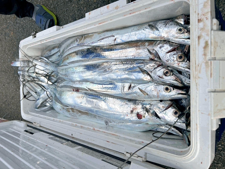 2025年12月16日 本日は太刀魚にて出船しました。西エリアに行きましたが、釣れる方釣れない方ありました。餌釣り 15本〜0本・ジギング 3本〜0本・サゴシ混じる |