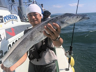 2016年 8月 4日 本日は太刀魚にて出船しました、親子で参加してくれたお客様の息子さんがドラゴンゲット(1.8kg)しました。 餌釣り 20本〜10本 6本指〜3本指 ルアーのお客様いませんでしたが、船長がラスト1時間浮いた反応を見つけ30本 4.5本指〜3本指を釣りました。 |