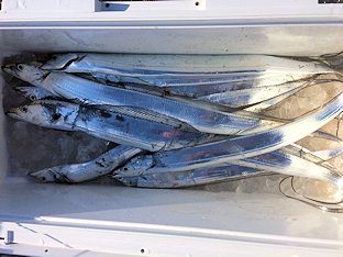 2016年 1月13日 本日は太刀魚にて出船しました、後半入れ食いのお客様もいました、29本〜9本 4本指〜3本指 サゴシ・スルメイカ・クロムツ・恵比寿ダイ混じりました。 |